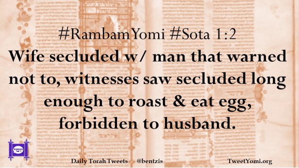 RambamYomi #Sota 1:2 Wife secluded w/ man that warned not to, witnesses saw secluded long enough to roast & eat egg, forbidden to husband.