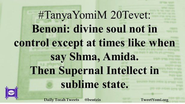 #TanyaYomiM 20Tevet: Benoni: divine soul not in control except at times like when say Shma, Amida. Then Supernal Intellect in sublime state.