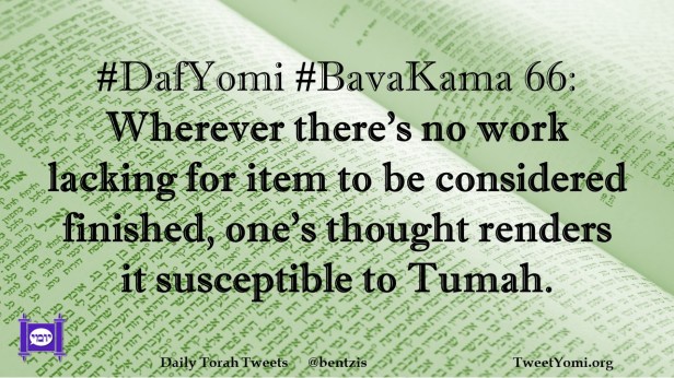 BavaKama, DafYomi #DafYomi #BavaKama 66 Date: January 10, 2024Author: netanelspitz #DafYomi #BavaKama 66: Wherever there’s no work lacking for item to be considered finished, one’s thought renders it susceptible to Tumah. Share this: Share on X (Opens in new window) X Share on Facebook (Opens in new window) Facebook Like Loading... Related