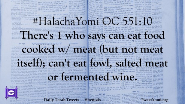 #HalachaYomi OC 551:10 There’s 1 who says can eat food cooked w/ meat (but not meat itself); can’t eat fowl, salted meat or fermented wine.