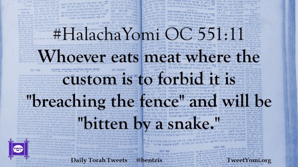 #HalachaYomi OC 551:11 Whoever eats meat where the custom is to forbid it is “breaching the fence” and will be “bitten by a snake.”