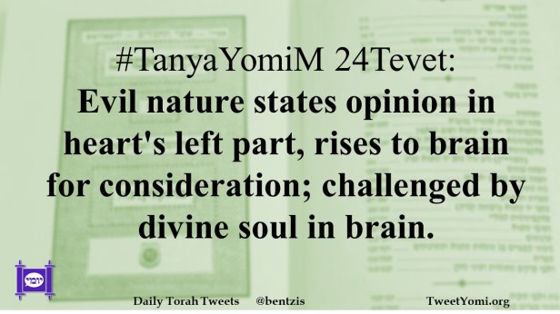 #TanyaYomiM 24Tevet: Evil nature states opinion in heart’s left part, rises to brain for consideration; challenged by divine soul in brain.
