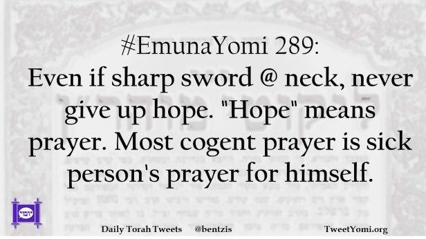 #EmunaYomi 289: Even if sharp sword @ neck, never give up hope. “Hope” means prayer. Most cogent prayer is sick person’s prayer for himself.