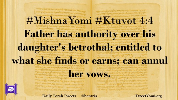 #MishnaYomi #Ktuvot 4:4 Father has authority over his daughter’s betrothal; entitled to what she finds or earns; can annul her vows.