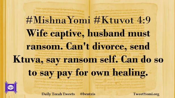 #MishnaYomi #Ktuvot 4:9 Wife captive, husband must ransom. Can’t divorce, send Ktuva, say ransom self. Can do so to say pay for own healing.