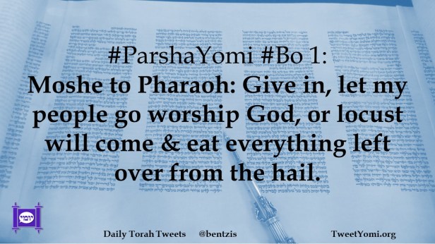 #ParshaYomi #Bo 1: Moshe to Pharaoh: Give in, let my people go worship God, or locust will come & eat everything left over from the hail.