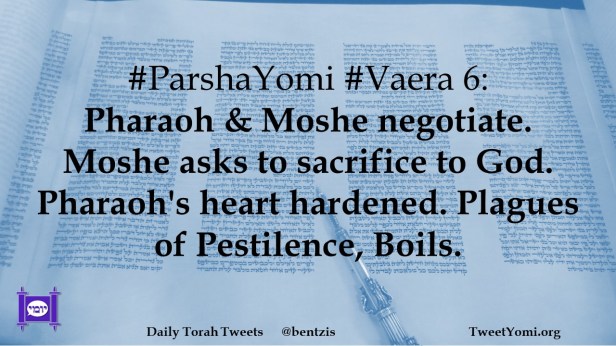 #ParshaYomi #Vaera 6: Pharaoh & Moshe negotiate. Moshe asks to sacrifice to God. Pharaoh’s heart hardened. Plagues of Pestilence, Boils.