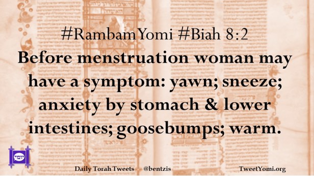 #RambamYomi #Biah 8:2 Before menstruation woman may have a symptom: yawn; sneeze; anxiety by stomach & lower intestines; goosebumps; warm.