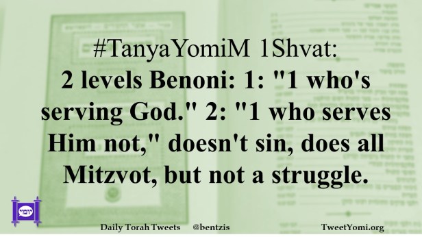 #TanyaYomiM 1Shvat: 2 levels Benoni: 1: “1 who’s serving God.” 2: “1 who serves Him not,” doesn’t sin, does all Mitzvot, but not a struggle.