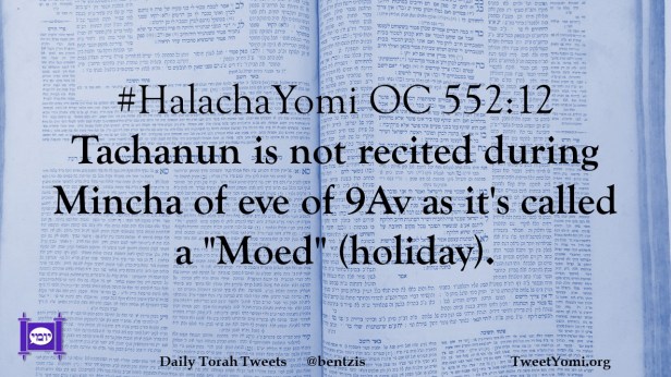 HalachaYomi #HalachaYomi OC 552:12 Date: January 16, 2024Author: netanelspitz #HalachaYomi OC 552:12 Tachanun is not recited during Mincha of eve of 9Av as it’s called a “Moed” (holiday). Share this: Share on X (Opens in new window) X Share on Facebook (Opens in new window) Facebook Like Loading... Related