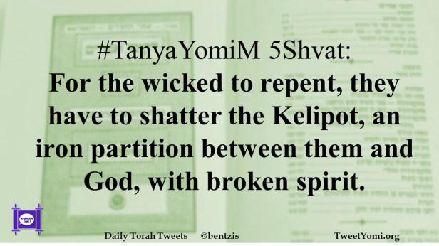 #TanyaYomiM 5Shvat: For the wicked to repent, they have to shatter the Kelipot, an iron partition between them and God, with broken spirit.