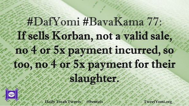 BavaKama, DafYomi #DafYomi #BavaKama 77 Date: January 22, 2024Author: netanelspitz #DafYomi #BavaKama 77: If sells Korban, not a valid sale, no 4 or 5x payment incurred, so too, no 4 or 5x payment for their slaughter. Share this: Share on X (Opens in new window) X Share on Facebook (Opens in new window) Facebook Like Loading... Related