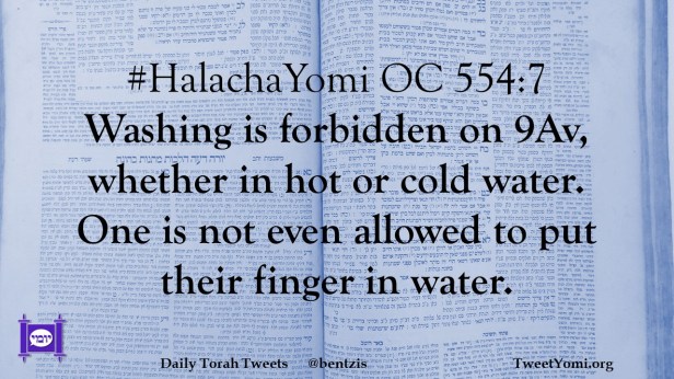 #HalachaYomi OC 554:7 Washing is forbidden on 9Av, whether in hot or cold water. One is not even allowed to put their finger in water.