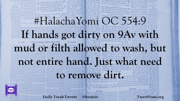 #HalachaYomi OC 554:9 If hands got dirty on 9Av with mud or filth allowed to wash, but not entire hand. Just what need to remove dirt.
