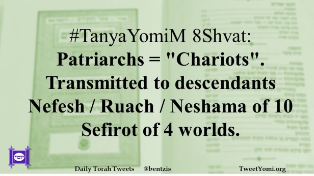 TanyaYomiM #TanyaYomiM 8Shvat Date: January 22, 2024Author: netanelspitz #TanyaYomiM 8Shvat: Patriarchs = “Chariots”. Transmitted to descendants Nefesh / Ruach / Neshama of 10 Sefirot of 4 worlds. Share this: Share on X (Opens in new window) X Share on Facebook (Opens in new window) Facebook Like Loading... Related