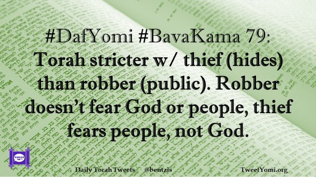 BavaKama, DafYomi #DafYomi #BavaKama 79 Date: January 23, 2024Author: netanelspitz #DafYomi #BavaKama 79: Torah stricter w/ thief (hides) than robber (public). Robber doesn’t fear God or people, thief fears people, not God. Share this: Share on X (Opens in new window) X Share on Facebook (Opens in new window) Facebook Like Loading... Related