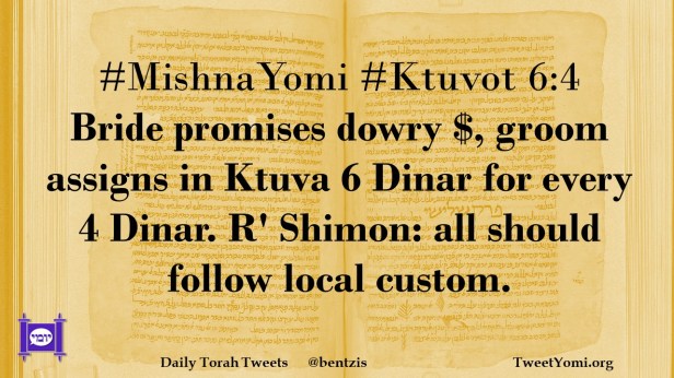 #MishnaYomi #Ktuvot 6:4 Bride promises dowry $, groom assigns in Ktuva 6 Dinar for every 4 Dinar. R’ Shimon: all should follow local custom.