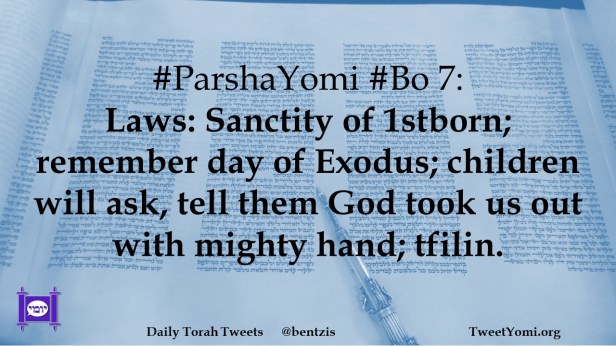 #ParshaYomi #Bo 7: Laws: Sanctity of 1stborn; remember day of Exodus; children will ask, tell them God took us out with mighty hand; tfilin.