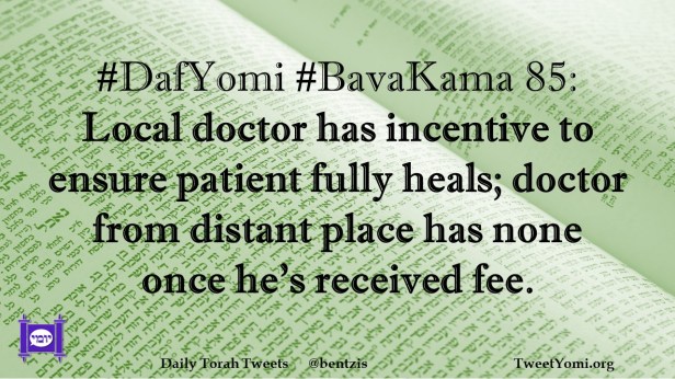 BavaKama, DafYomi #DafYomi #BavaKama 85 Date: January 28, 2024Author: netanelspitz #DafYomi #BavaKama 85: Local doctor has incentive to ensure patient fully heals; doctor from distant place has none once he’s received fee. Share this: Share on X (Opens in new window) X Share on Facebook (Opens in new window) Facebook Like Loading... Related