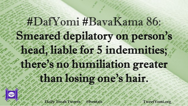 BavaKama, DafYomi #DafYomi #BavaKama 86 Date: January 28, 2024Author: netanelspitz #DafYomi #BavaKama 86: Smeared depilatory on person’s head, liable for 5 indemnities; there’s no humiliation greater than losing one’s hair. Share this: Share on X (Opens in new window) X Share on Facebook (Opens in new window) Facebook Like Loading... Related