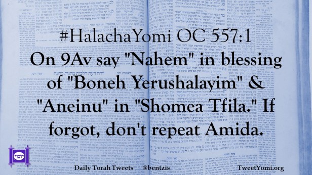#HalachaYomi OC 557:1 On 9Av say “Nahem” in blessing of “Boneh Yerushalayim” & “Aneinu” in “Shomea Tfila.” If forgot, don’t repeat Amida.