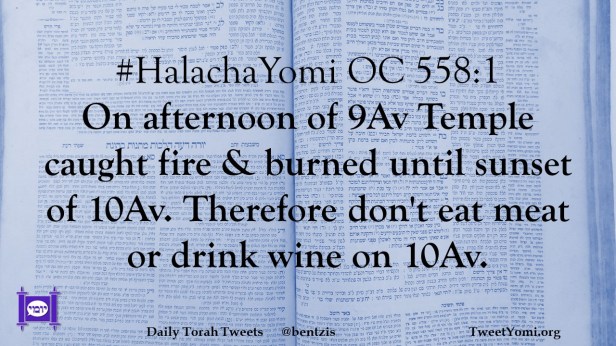 #HalachaYomi OC 558:1 On afternoon of 9Av Temple caught fire & burned until sunset of 10Av. Therefore don’t eat meat or drink wine on 10Av.