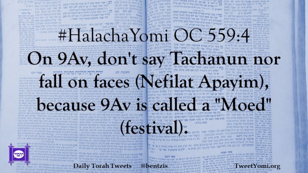 #HalachaYomi OC 559:4 On 9Av, don’t say Tachanun nor fall on faces (Nefilat Apayim), because 9Av is called a “Moed” (festival).