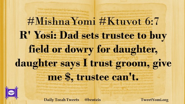 #MishnaYomi #Ktuvot 6:7 R’ Yosi: Dad sets trustee to buy field or dowry for daughter, daughter says I trust groom, give me $, trustee can’t.