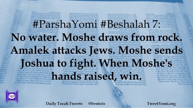 #ParshaYomi #Beshalah 7: No water. Moshe draws from rock. Amalek attacks Jews. Moshe sends Joshua to fight. When Moshe’s hands raised, win.