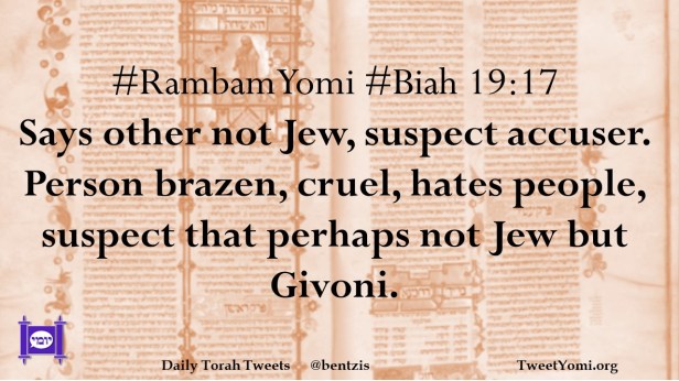 #RambamYomi #Biah 19:17 Says other not Jew, suspect accuser. Person brazen, cruel, hates people, suspect that perhaps not Jew but Givoni.