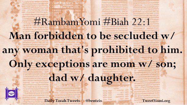 #RambamYomi #Biah 22:1 Man forbidden to be secluded w/ any woman that’s prohibited to him. Only exceptions are mom w/ son; dad w/ daughter.