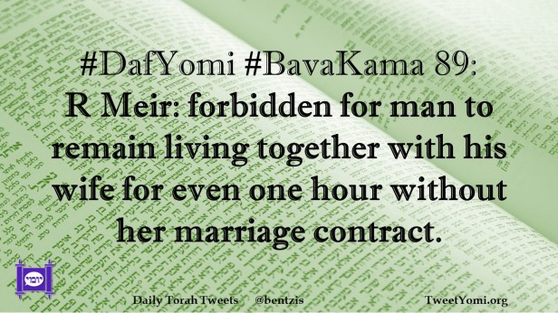 BavaKama, DafYomi #DafYomi #BavaKama 89 Date: February 4, 2024Author: netanelspitz #DafYomi #BavaKama 89: R Meir: forbidden for man to remain living together with his wife for even one hour without her marriage contract. Share this: Share on X (Opens in new window) X Share on Facebook (Opens in new window) Facebook Like Loading... Related