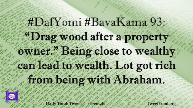 BavaKama, DafYomi #DafYomi #BavaKama 93 Date: February 4, 2024Author: netanelspitz #DafYomi #BavaKama 93: “Drag wood after a property owner.” Being close to wealthy can lead to wealth. Lot got rich from being with Abraham. Share this: Share on X (Opens in new window) X Share on Facebook (Opens in new window) Facebook Like Loading... Related