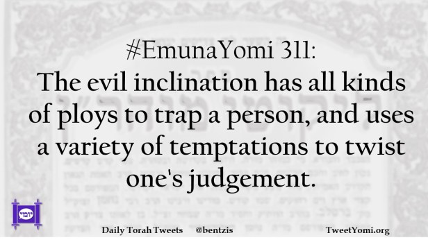 #EmunaYomi 311: The evil inclination has all kinds of ploys to trap a person, and uses a variety of temptations to twist one’s judgement.