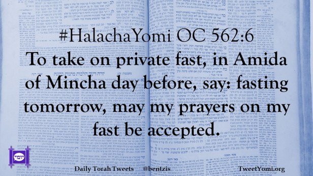 #HalachaYomi OC 562:6 To take on private fast, in Amida of Mincha day before, say: fasting tomorrow, may my prayers on my fast be accepted.