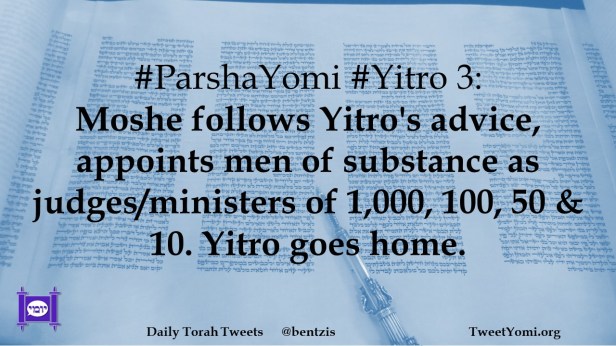 #ParshaYomi #Yitro 3: Moshe follows Yitro’s advice, appoints men of substance as judges/ministers of 1,000, 100, 50 & 10. Yitro goes home.