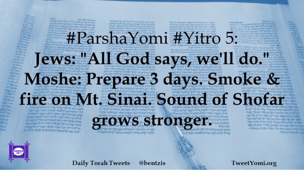 #ParshaYomi #Yitro 5: Jews: “All God says, we’ll do.” Moshe: Prepare 3 days. Smoke & fire on Mt. Sinai. Sound of Shofar grows stronger.
