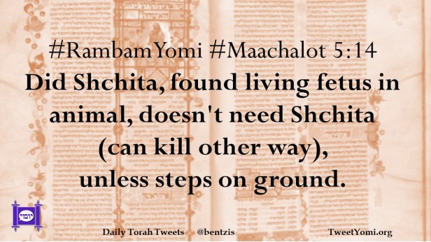 #RambamYomi #Maachalot 5:14 Did Shchita, found living fetus in animal, doesn’t need Shchita (can kill other way), unless steps on ground.