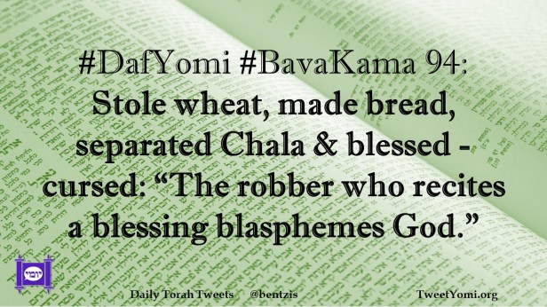 BavaKama, DafYomi #DafYomi #BavaKama 94 Date: February 7, 2024Author: netanelspitz #DafYomi #BavaKama 94: Stole wheat, made bread, separated Chala & blessed – cursed: “The robber who recites a blessing blasphemes God.” Share this: Share on X (Opens in new window) X Share on Facebook (Opens in new window) Facebook Like Loading... Related