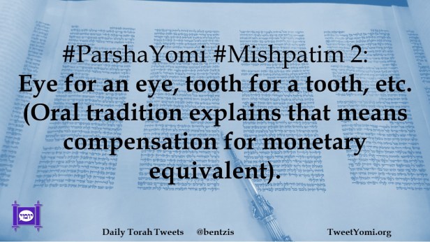 #ParshaYomi #Mishpatim 2: Eye for an eye, tooth for a tooth, etc. (Oral tradition explains that means compensation for monetary equivalent).