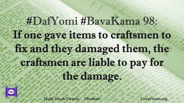 BavaKama, DafYomi #DafYomi #BavaKama 98 Date: February 11, 2024Author: netanelspitz #DafYomi #BavaKama 98: If one gave items to craftsmen to fix and they damaged them, the craftsmen are liable to pay for the damage. Share this: Share on X (Opens in new window) X Share on Facebook (Opens in new window) Facebook Like Loading... Related