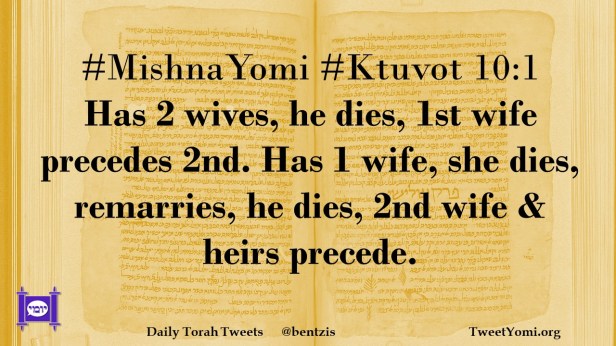 #MishnaYomi #Ktuvot 10:1 Has 2 wives, he dies, 1st wife precedes 2nd. Has 1 wife, she dies, remarries, he dies, 2nd wife & heirs precede.