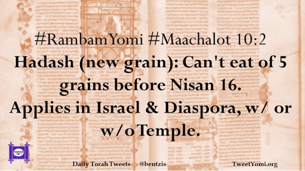 #RambamYomi #Maachalot 10:2 Hadash (new grain): Can’t eat of 5 grains before Nisan 16. Applies in Israel & Diaspora, w/ or w/o Temple.