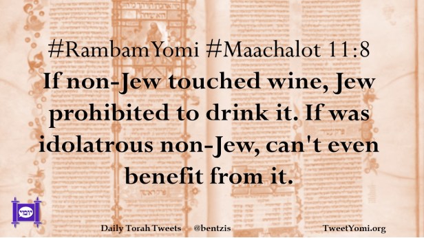 #RambamYomi #Maachalot 11:8 If non-Jew touched wine, Jew prohibited to drink it. If was idolatrous non-Jew, can’t even benefit from it.