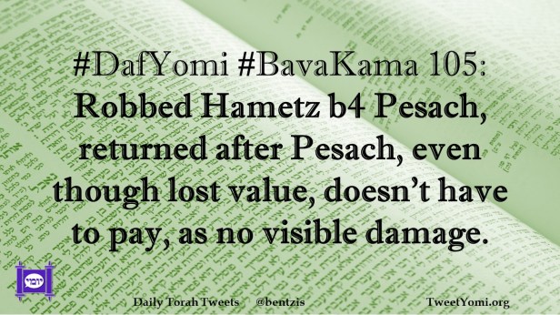 BavaKama, DafYomi #DafYomi #BavaKama 105 Date: February 18, 2024Author: netanelspitz #DafYomi #BavaKama 105: Robbed Hametz b4 Pesach, returned after Pesach, even though lost value, doesn’t have to pay, as no visible damage. Share this: Share on X (Opens in new window) X Share on Facebook (Opens in new window) Facebook Like Loading... Related