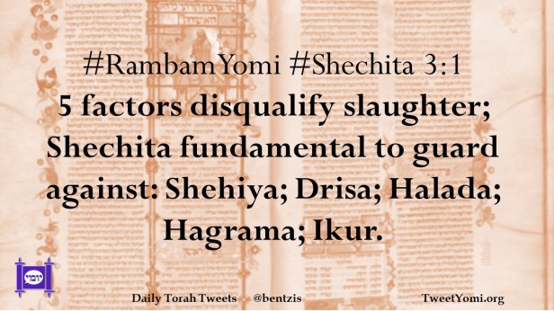 #RambamYomi #Shechita 3:1 5 factors disqualify slaughter; Shechita fundamental to guard against: Shehiya; Drisa; Halada; Hagrama; Ikur.