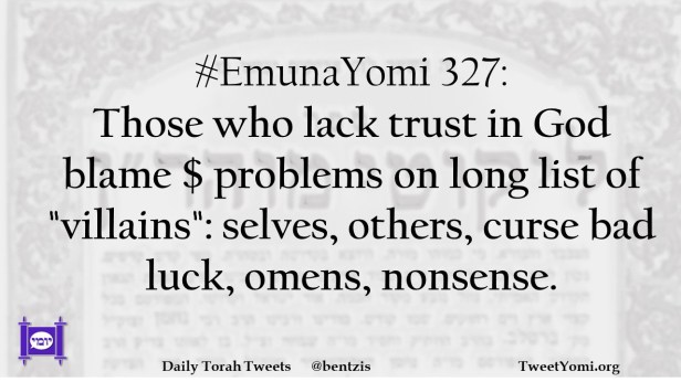 #EmunaYomi 327: Those who lack trust in God blame $ problems on long list of “villains”: selves, others, curse bad luck, omens, nonsense.