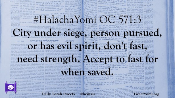 #HalachaYomi OC 571:3 City under siege, person pursued, or has evil spirit, don’t fast, need strength. Accept to fast for when saved.
