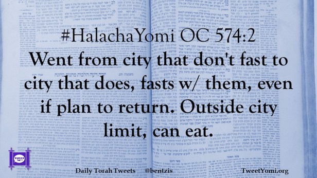 #HalachaYomi OC 574:2 Went from city that don’t fast to city that does, fasts w/ them, even if plan to return. Outside city limit, can eat.