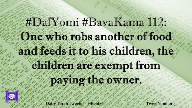 BavaKama, DafYomi #DafYomi #BavaKama 112 Date: February 25, 2024Author: netanelspitz #DafYomi #BavaKama 112: One who robs another of food and feeds it to his children, the children are exempt from paying the owner. Share this: Share on X (Opens in new window) X Share on Facebook (Opens in new window) Facebook Like Loading... Related
